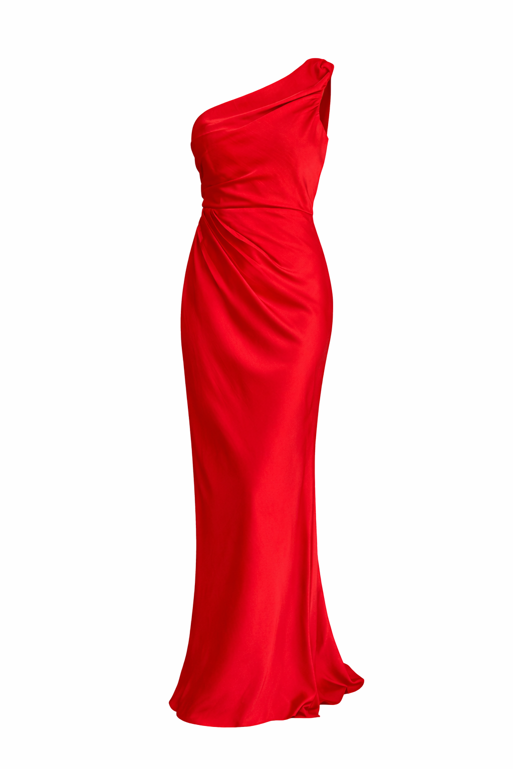 Vestido largo de un solo hombro con diseño elegante y femenino, confeccionado en tela satinada de acabado suave.